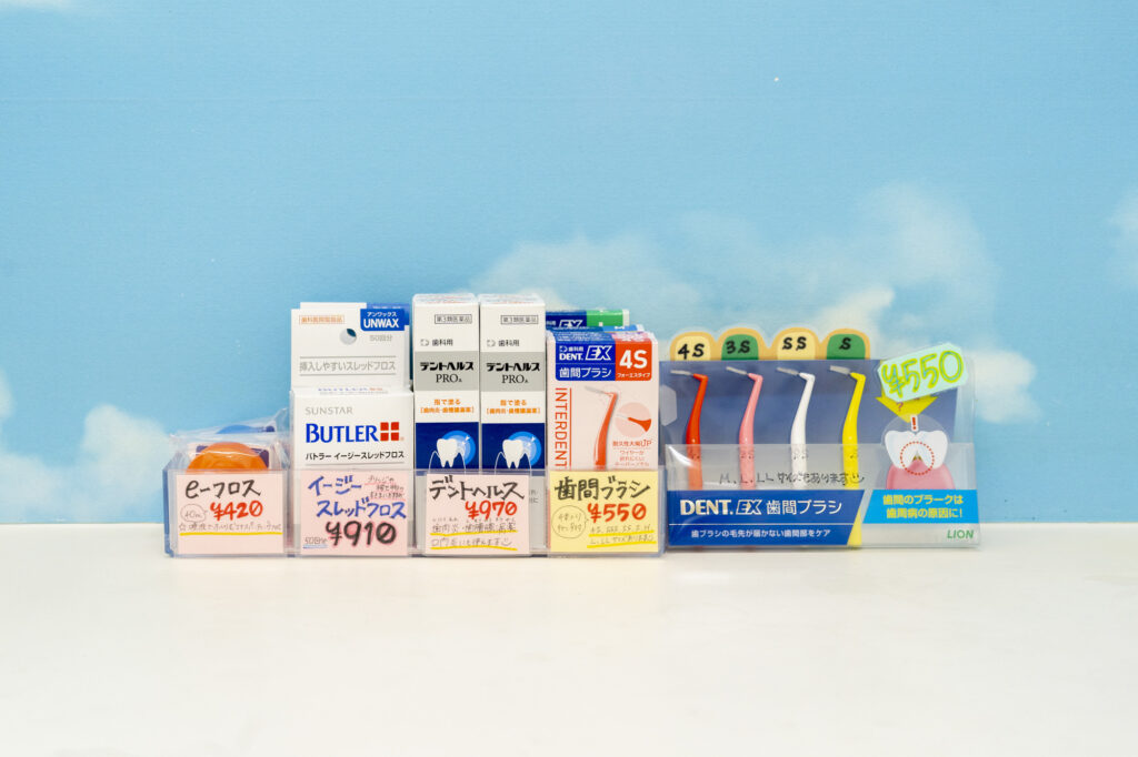 当院歯科衛生士がおススメする、歯ブラシ、タフト、歯間ブラシ、フロスなどご自宅でのケアをより効果的にするグッズも多数ございます。