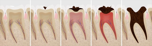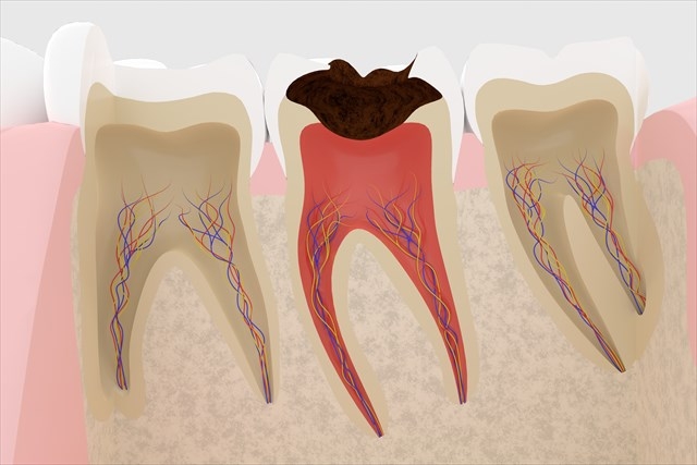 まず、むし歯になった部分を削り取って、歯の神経(歯髄)のあるところまで穴をあけます。そして、ばい菌が侵入してしまった歯髄を除去して、神経の通っている穴(歯髄腔)とそれにつながる根の中の根管の壁を少し削りながら、全体をきれいに掃除していくことです。